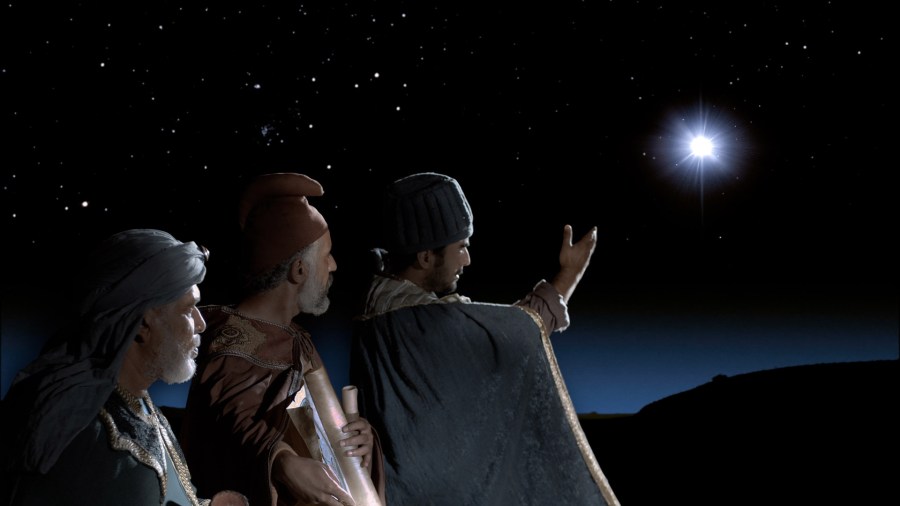 Des sages (mages) de l’Est virent une étoile nouvelle et très brillante dans le ciel. Pour eux, c’était le signe d’un roi nouveau-né. Ils sont partis dans la direction de l’étoile pour lui apporter des cadeaux.
