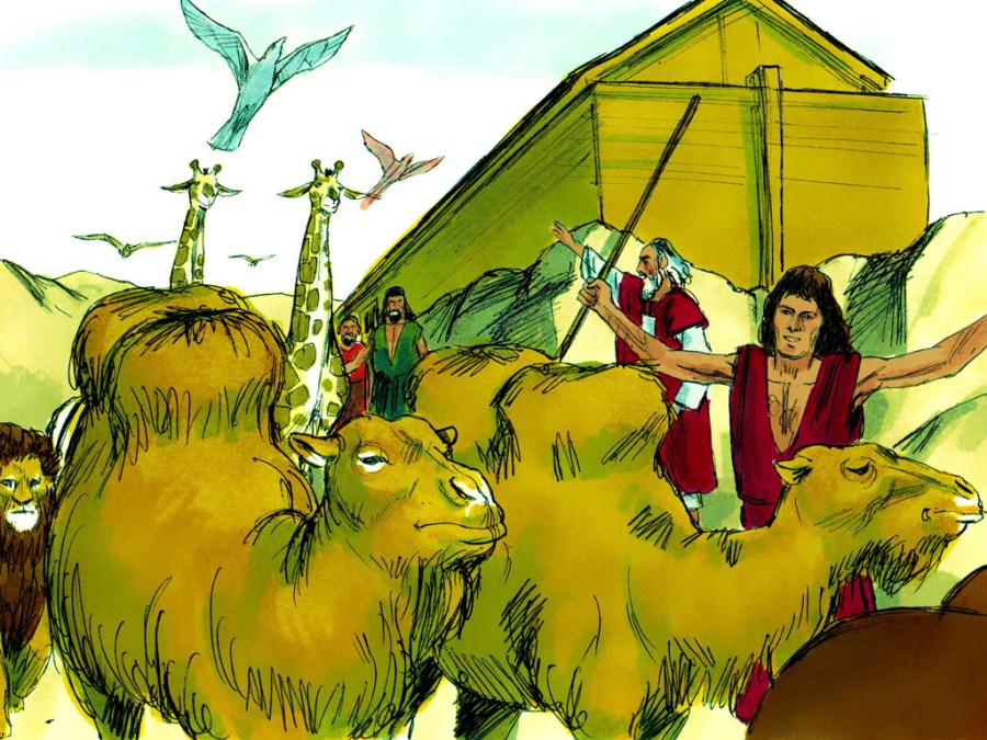 Noé ôta le toit de l’arche et vit que la terre séchait. Deux mois plus tard, la terre fut assez sèche pour que Noé, sa famille et les animaux puissent quitter l’arche.