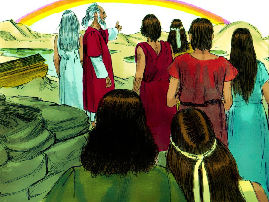 Dieu mit un arc-en-ciel dans les cieux. Dieu dit alors à Noé: « Cet arc-en-ciel est le signe de ma promesse de ne plus jamais inonder la terre entière. »
