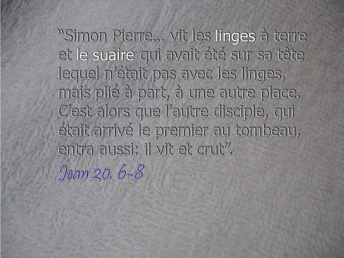 Ce que Jean voit en entrant dans le tombeau, ce sont donc les bandelettes, alourdies par le poids des aromates, qui gisent par terre comme un étui vide. Quant au suaire, il conserve la forme arrondie qu’il avait prise autour de la tête de Jésus et ressemble donc à un turban vide. En effet, le mot grec traduit par “roulé” est mieux rendu par «enveloppé» dans les versets cités plus haut.