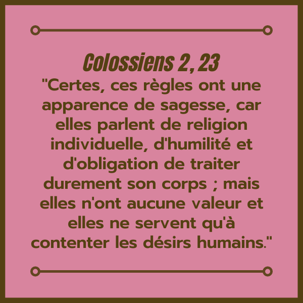 Dans notre comportement, il y a souvent confusion entre ce qui relève de notre culture, de notre environnement ou tout simplement de nos habitudes, d’une part, et ce qui est prescrit par la Parole de Dieu, d’autre part. Les habitudes extérieures, quand elles sont liées à la vie chrétienne, collective en particulier, prennent facilement force de loi spirituelle. On retrouve alors le joug que faisait peser la tradition pharisaïque sur les Juifs du temps du Seigneur.
