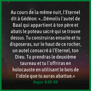 Dieu demande à Gédéon de détruire les idoles de son père. Il s’agit de renverser la construction de pierres qui permettait d’offrir des sacrifices à Baal et de couper le poteau dressé à côté. Puis il devait bâtir un autel au vrai Dieu pour y offrir un sacrifice. Ces gestes concrets, visibles, représentaient une terrible profanation pour des esprits idolâtres et superstitieux, prêts à venger leurs dieux.