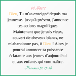 Quelle bénédiction quand les personnes âgées transmettent aux plus jeunes la sagesse que Dieu leur a montrée ! Cette sagesse est destinée à circuler à travers les générations.