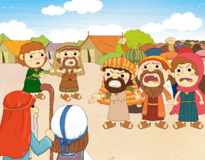 Dans cette histoire, le peuple de Dieu prend peur lorsqu’il découvre les peuples étrangers dans le pays promis. Tous se révoltent contre Dieu, sauf Josué et Caleb qui déclarent leur confiance en Dieu pour conquérir ce bon pays. Dieu est alors très en colère et de prime abord, il est prêt à exterminer tout le peuple pour en former un autre qui acceptera son cadeau. Moïse lui rappelle alors qu’il est un Dieu bon et compatissant. Il lui demande d’être celui qu’il est et le supplie de pardonner à son peuple. Alors Dieu pardonne, mais il punit toute cette génération rebelle. Aucun d’eux n’entrera dans le pays promis, sauf Caleb et Josué qui y auront accès grâce à leur confiance et fidélité en Dieu. Le peuple va alors errer 40 ans dans le désert dans l’attente que toute cette génération meurt.