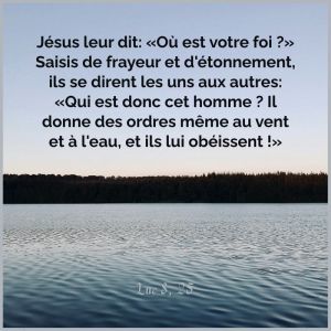 DIM | 30 MARS | Luc 8,25 « Où est votre foi ? » « Après tout, nous avons failli nous noyer et tu dormais ». Il est certain que personne n’aurait osé dire cela. En tout cas, tous étaient profondément touchés par la puissance de Jésus, au point que même le vent et les vagues lui obéissent. Es-tu conscient que Jésus est là dans les tempêtes de ta vie ? Lui fais-tu confiance pour être avec toi dans la tempête et pour dire au vent de se calmer ? Je te le dis aujourd’hui : Jésus est là. Tu peux lui faire confiance.
