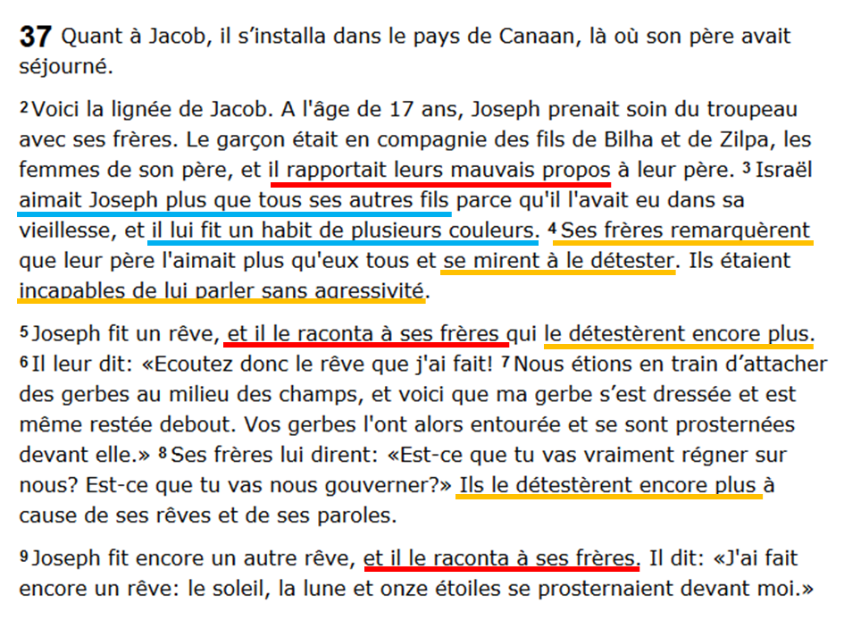 Et toi, qu’en penses-tu? Les frères de Joseph avaient-ils des raisons d’être jaloux de leur frère? Relis les versets 1 à 9. Pour bien cerner la situation, tu peux p. ex. souligner: